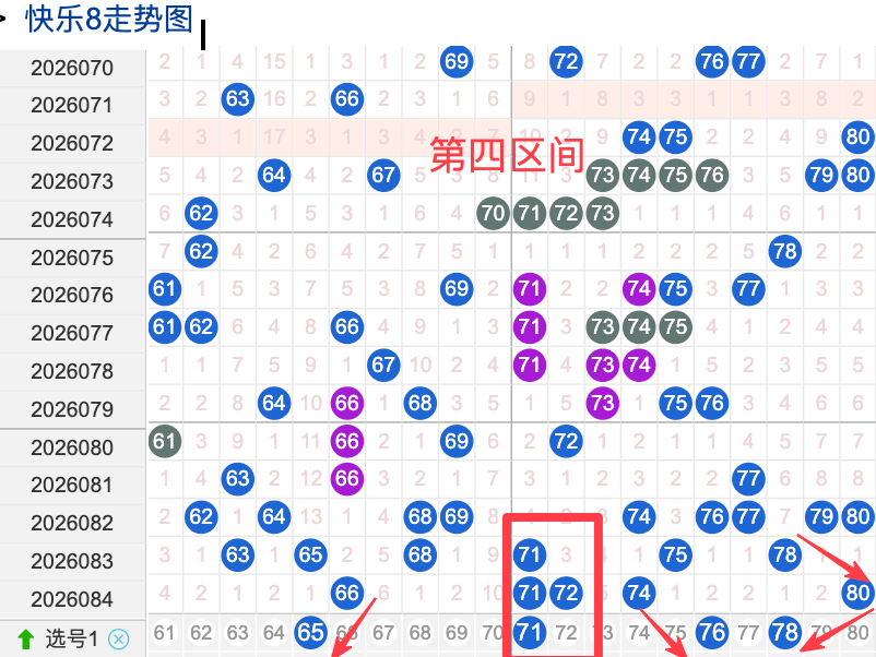 上期四区间开出了5个奖号(66.71.72.74.80)上期的四区开5个奖号呈现了一个递减趋势,开出的奖号6回补1码7回补3码,先来看号码65在近 30 期内属于还不是稳定的号码,近期出现频率相对,偶尔会间隔多期后出现一次,这个号码要注意防守,号码71具有一定的间歇性近期活跃度还是很稳定比如有时会间隔38期就再次出现,有时会间隔多期,近期整体出现频率比较,近期还是要关注的.号码76活跃度近期比较,有一定的间歇性,整体走势有一定的波动性.