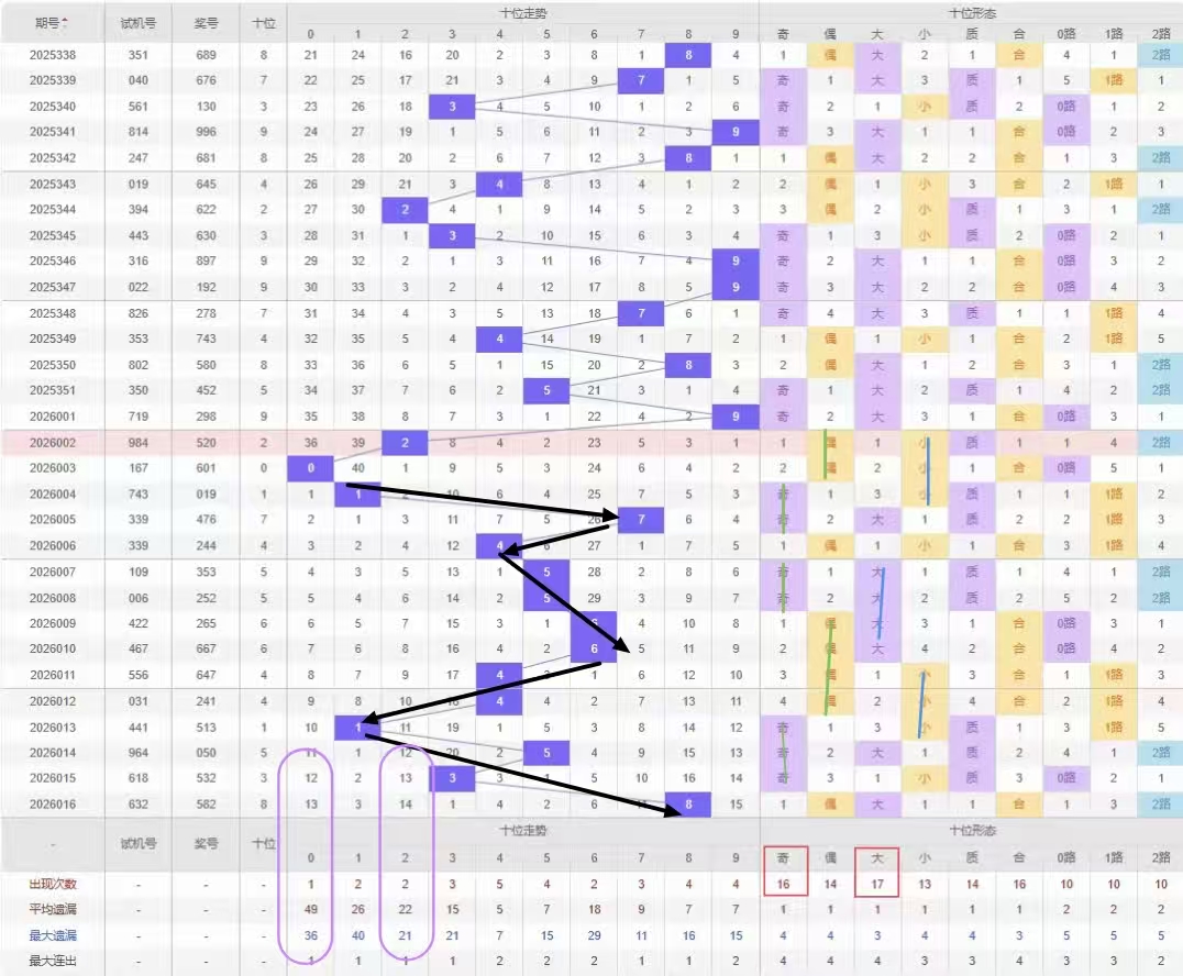 同理分析本期百位奇偶数形态,可以看到近15期开出奇数号5期偶数号10期,开出偶数号的概率是开出奇数号概率的2倍,上两期开出奇数号那么本期继续开出奇数的概率上升建议选择遗漏期数较大的奇数号。杀号建议定在所有偶数号,但偶数号4号、8号都已经遗漏了10期以上建议开出防冷号开出。