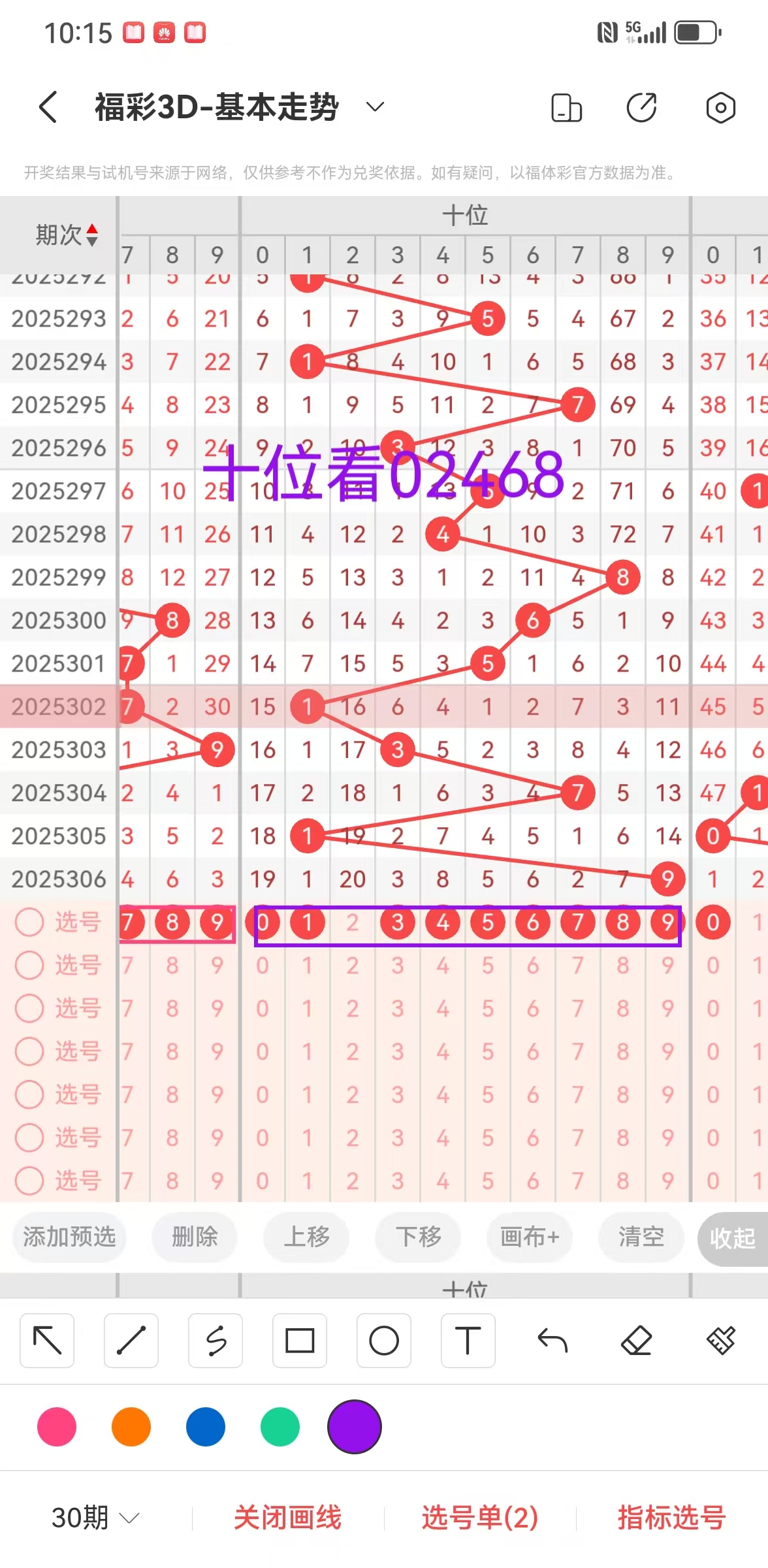 ②十位大小比:近5期大小比2:3,大号依次开出为:79, 大号中奇偶比,2:0,小号依次开出为:131,小号中奇偶比0:3,通过对比分析得出(57913024)有可能开其一