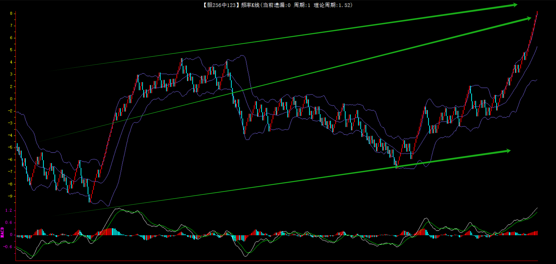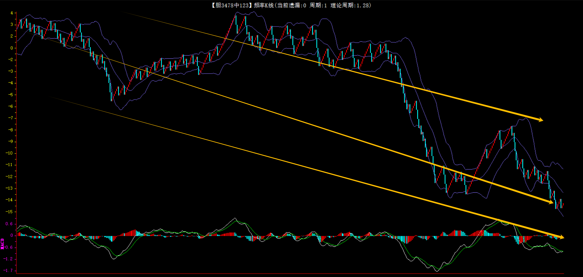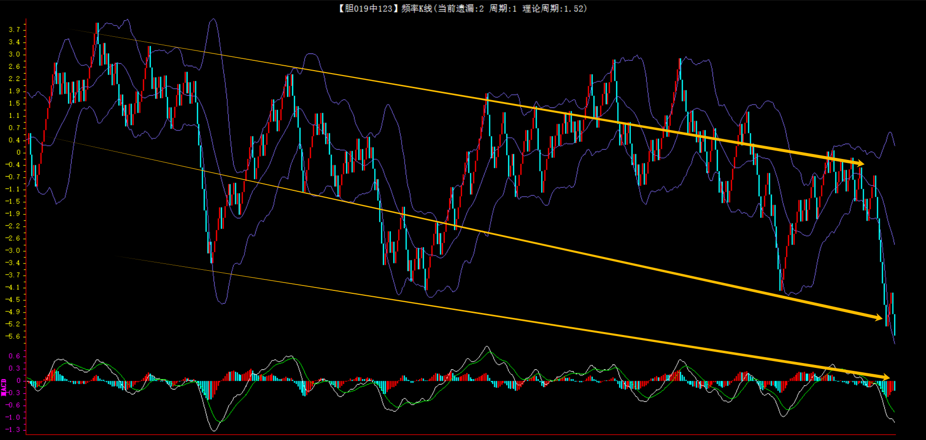 整体趋势下行,上边沿线趋势向下,下边沿趋势也是向下,节点震荡,当前遗漏2期,本期防守。