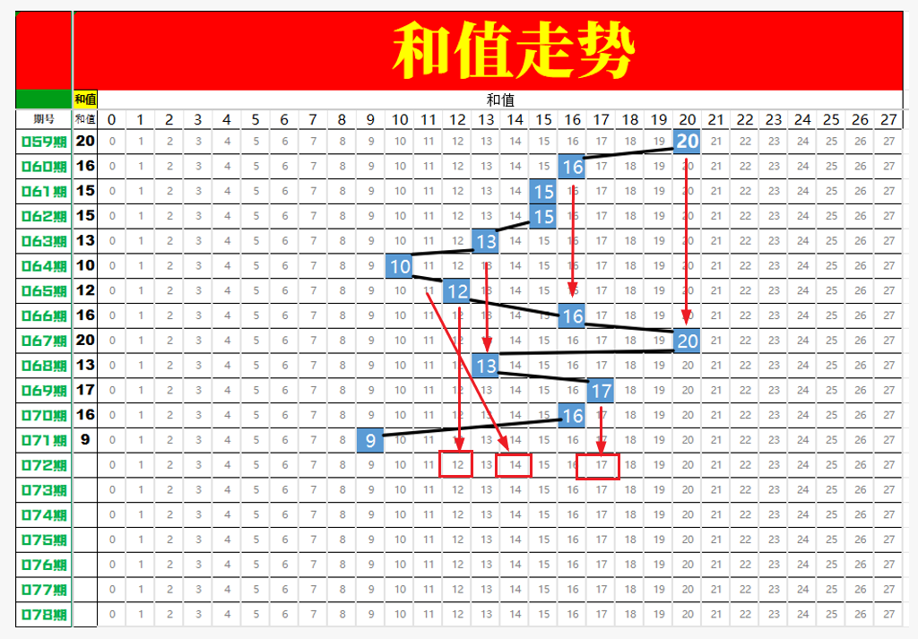 和值也是我比较喜欢研究的一个点,通过近十多期以来的走势分析来看。它总是成双成对的出现在一块,也就是和值的冷热虽然不明显,但是总是有一些数字是喜欢重新开出来。所以,本期我重点关注的和值是12.14.17。
