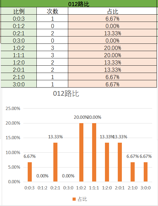 上期012路比是3:0:0,其中3:0:0占比变大,1:2:0占比变小。近15期内1:1:1,1:0:2是开出最多的,是然后是1:2:0,0:2:1,2:0:1,最后是0:0:3,2:1:0,3:0:0。总的看2路最热门,其次是1路,最后是0路,本期看好1:1:1和1:0:2。