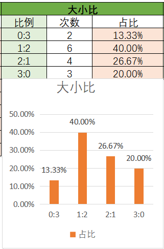 上期大小比为2:1,各个类型占比没有变化。可以看到近15期内1:2优势最好的,其次是2:1,然后是3:0,最后是0:3。本期看好2:1开出,其次是1:2。