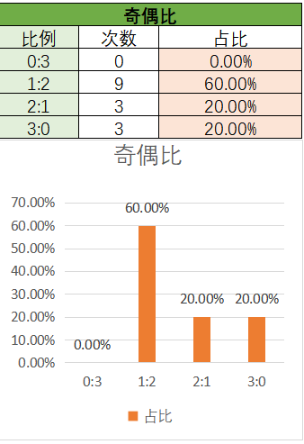 上期奇偶比为2:1,其中2:1占比变大,1:2占比变小。近15期内1:2优势最大,然后是3:0,2:1。上期开了1:2奇偶比,本期看好2:1奇偶比的开出,其次是1:2。