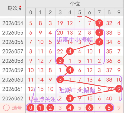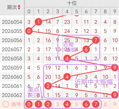 7期(056~062)开奖号十位号码球分别为7、6、4、9、4、2、9,开奖号与上一期走出的振幅分别为7、1、2、5、5、2、7。056期走出7号大数号码球,走出“7”的大幅度,057期走出6号中大数号码球,走出“1”的小幅度,058期走出4号中小数号码球,走出“2”的小幅度059期走出9号大数号码球,走出“5”的中大幅度,060期走出4号中小数号码球,走出“5”的中大幅度,061期走出2号小数号码球,走出“2”的小幅度,062期走出9号大数号码球,走出“7”的大幅度;从振幅大小及走势图的整体对应来看,中大振幅走在5~9之间较为适宜,中小振幅走在2~3之间较为适宜;结合走势图的上下对应及振幅大小分析,本期十位应重点关注号码球为0、1、2、4、6、7