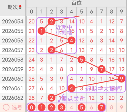 7期(056~062)开奖号百位号码球分别为4、2、5、7、9、4、2,开奖号与上一期走出的振幅分别为3、2、3、2、2、5、2。056期走出4号中小数号码球,走出“3”的中小幅度,057期走出2号小数号码球,走出“2”的小幅度,058期走出5号中大数号码球,走出“3”的中小幅度059期走出7号大数号码球,走出“2”的小幅度,060期走出9号大数号码球,走出“2”的小幅度,061期走出4号中小数号码球,走出“5”的中大幅度,062期走出2号小数号码球,走出“2”的小幅度;从振幅大小及走势图的整体形势,中大幅度走在3~5之间较为适宜,中小幅度走在0~2之间较为适宜;结合走势图的整体及大小走势分析,本期百位需重点关注号码球为0、1、2、3、5、7