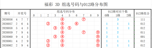 7期(056~062)开奖号与012路组合分别为477(111)、264(012)、543(012)、794(011)、943(001)、429(012)、294(012)上期开奖号为012路组合,根据整体走势分析,本期看好的012路组合有:022、012、001,002、112、011组合。
