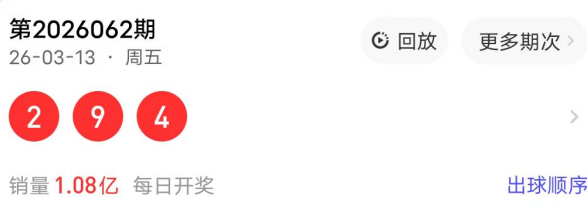 2026062期开奖号码为294,奇偶值为12偶;大小值为12小;012路走势为012路;跨度为7跨;和值15点;组六形态。