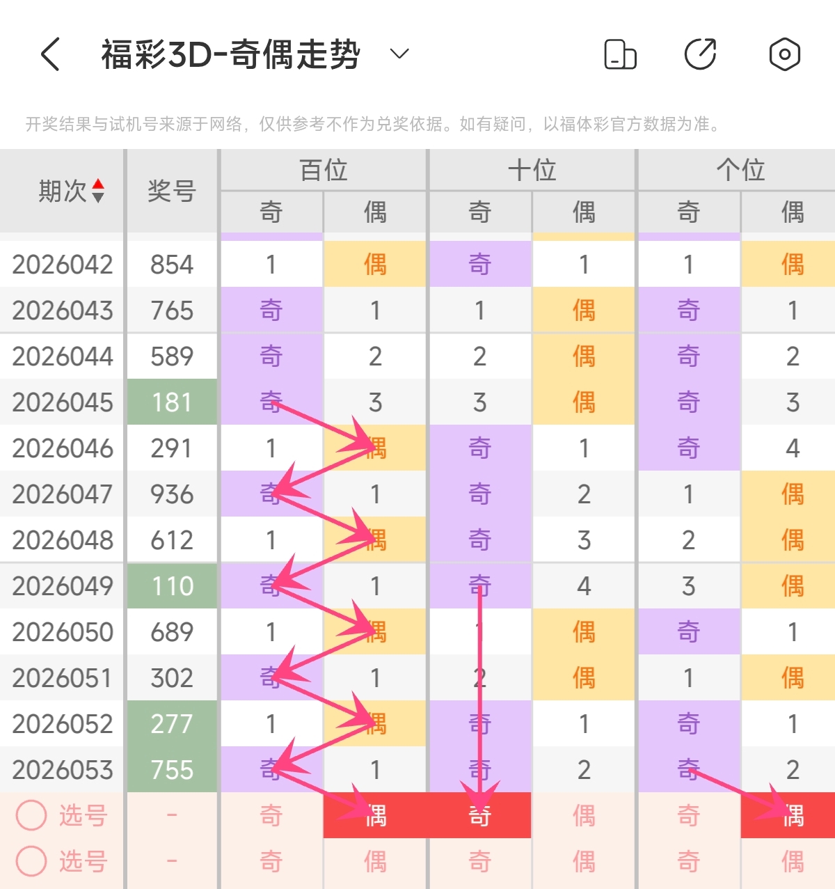 首先让我们回顾一下上期福彩3D第2026053期开奖号码为755,为组三形态,大小比为3:0,奇偶比为3:0,跨度为2,和值为17。