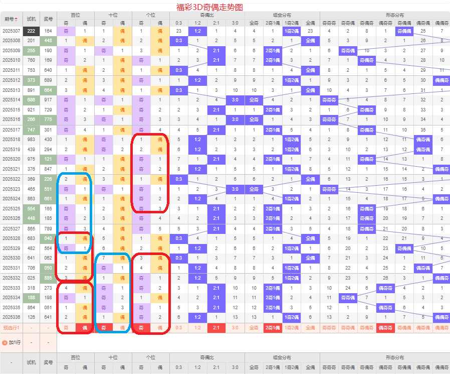 上期奇偶比是1:2,两偶的号码组合方式,从近五期的奇偶数出现情况看,奇数出现8次,偶数出现7次,奇数偶数号码出现较平均,本期侧重两奇的号码组合,侧重偶奇奇或偶偶奇的号码组合方式,根据奇偶形态做五码定位02468/13579/13579或02468/02468/13579