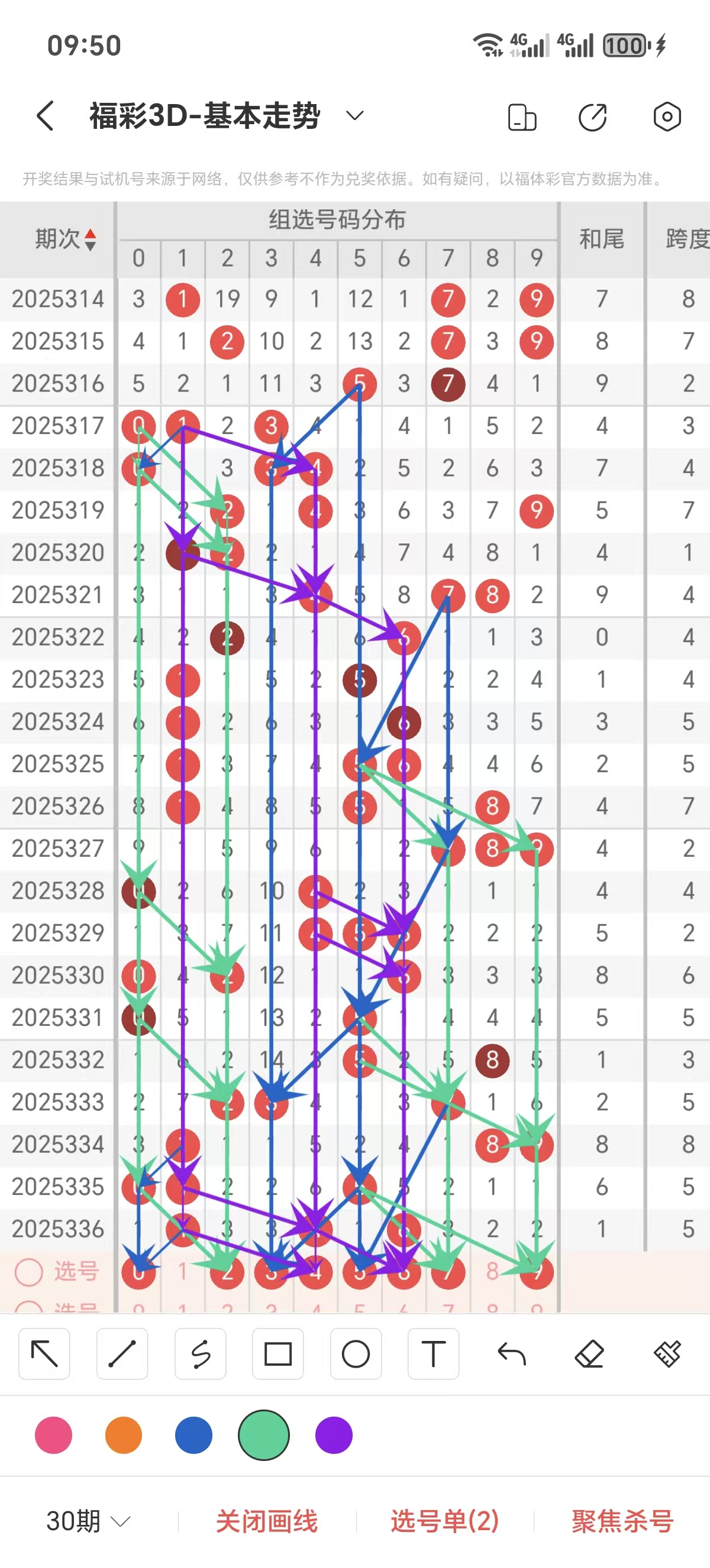 跨度通常情况下在五期之内重复一个跨度的概率很高,近五期重复了5的跨度,近五期跨度为3/5/8/5/5,近期02路的跨度较热,上期是2路的跨度,本期要侧重跨度以3/5/7跨为主的号码组合。可以从跨度方面选择相应的双胆码组合,双胆码的选取要根据近期和历史的走势进一步的分析选取。