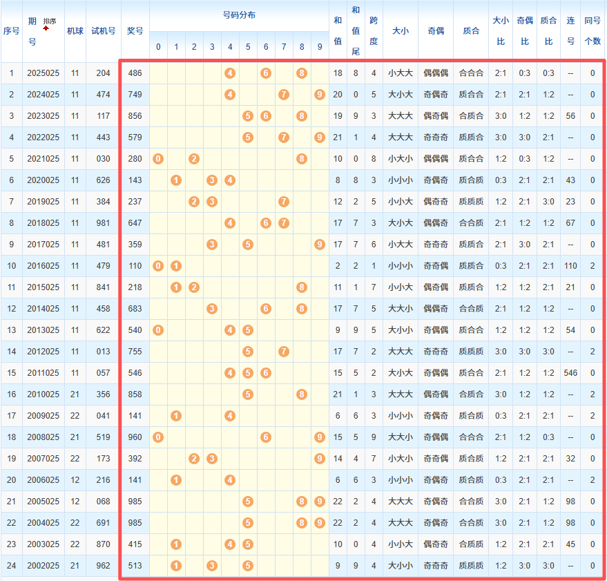 1、统计往年同期开奖号码