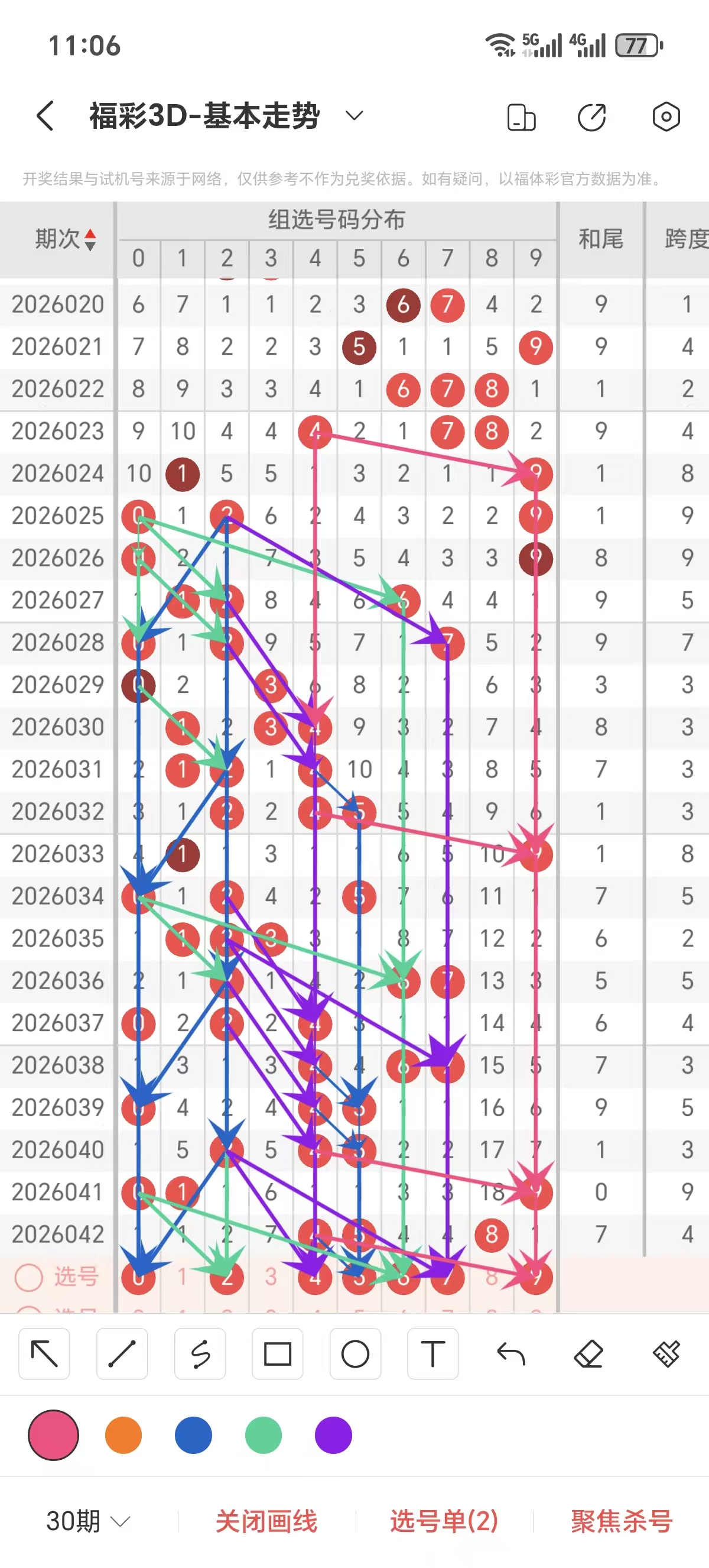 跨度通常情况下在五期之内重复一个跨度的概率很高,近五期重复了3的跨度,近五期跨度为3/5/3/9/4,近期0路的跨度较热,上期是1路的跨度,本期要侧重跨度以4/5/7跨为主的号码组合。可以从跨度方面选择相应的双胆码组合,双胆码的选取要根据近期和历史的走势进一步的分析选取。