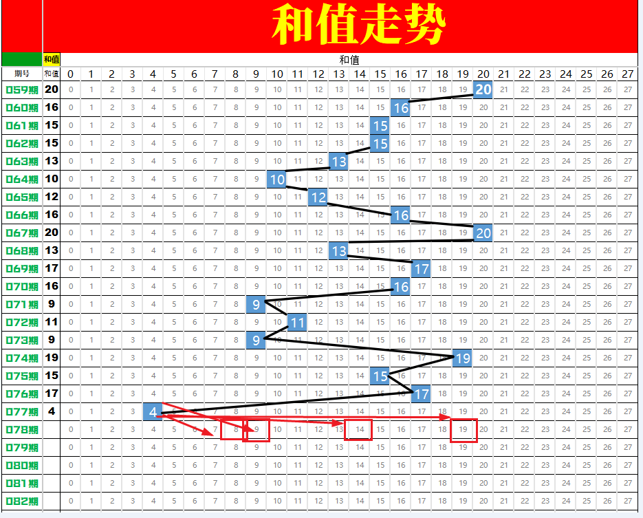 这期和值就有点难度了,所以大家也就做个参考即可。我本期的和值选择思路也是比较简单,就是按照差值为5的形式进行递增画线。