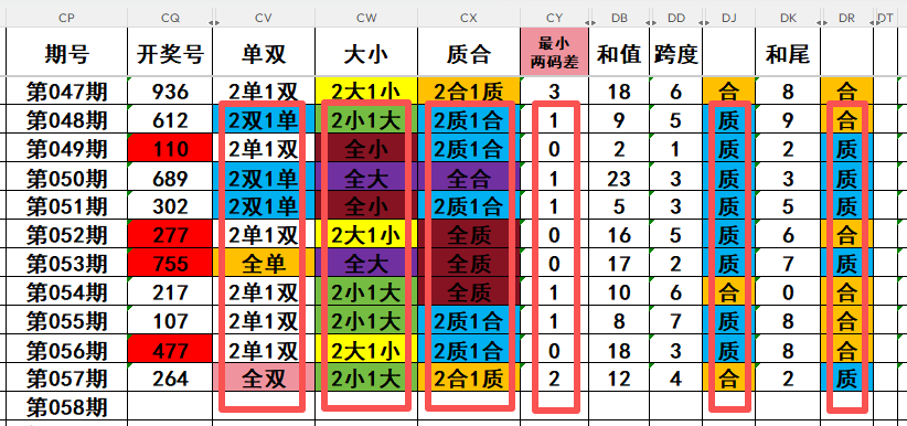 3,最近10天当中,两质一合开出5次,两合一质开出1次,全质开出3次,全合开出1次。近期需重点关注开奖号两合一质号码的回补!