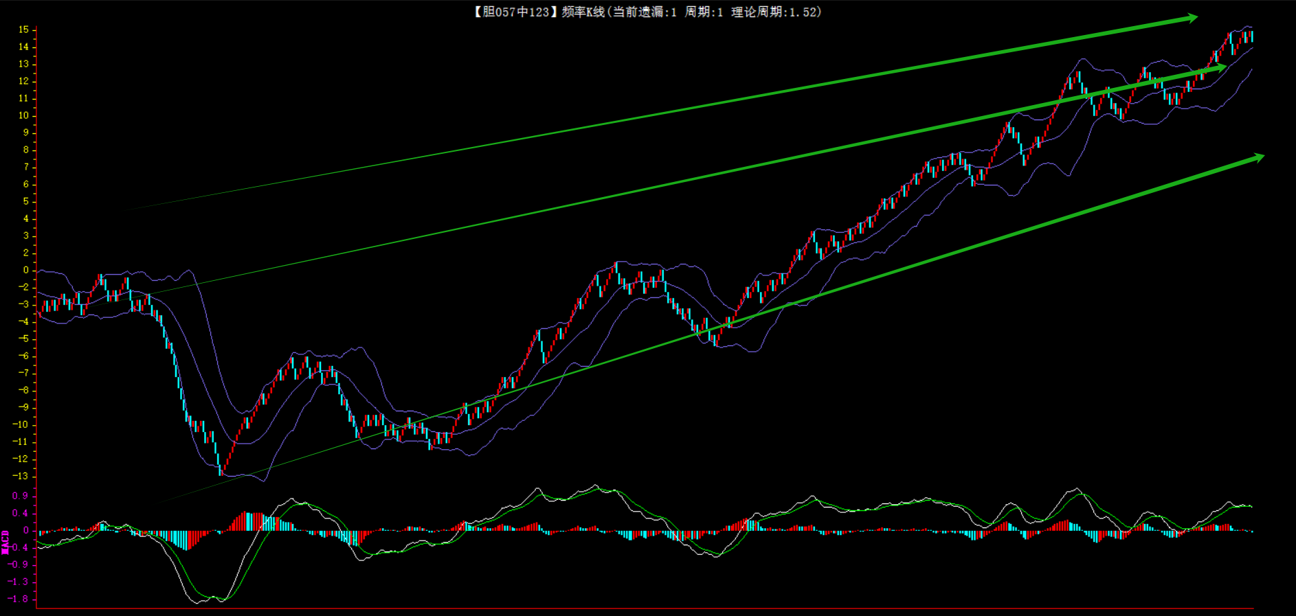 整体趋势上行,上边沿线趋势向上,下边沿趋势也是向上,节点震荡,当前遗漏1期,本期关注。