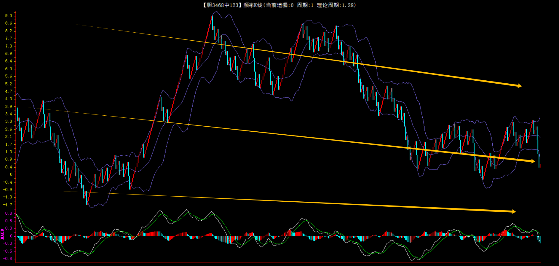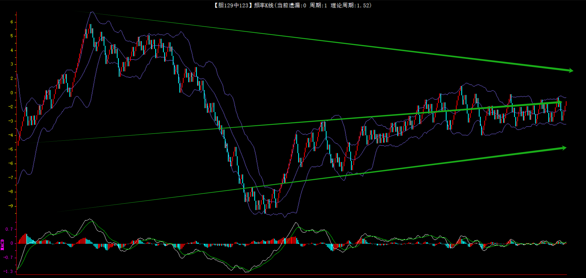 整体趋势下行,上边沿线趋势向下,下边沿趋势也是向下,节点震荡,当前开1期,本期防守。