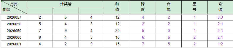 2026057期开奖号码264,我们可以看出近30期百位2出现5次(较058期减一),十位6出现4次,个位4出现2次。