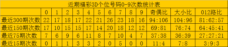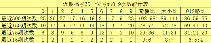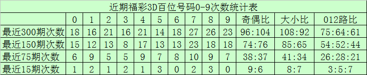 个位分析:最近300期奖号由冷到热表现为:3→22次,1→23次,9→24次,2→27次,4→29次,0→31次,7→34次,5、8→36次,6→38次,该位号码奇偶比为139:161,大小比为168:132,012路比为115:86:99。