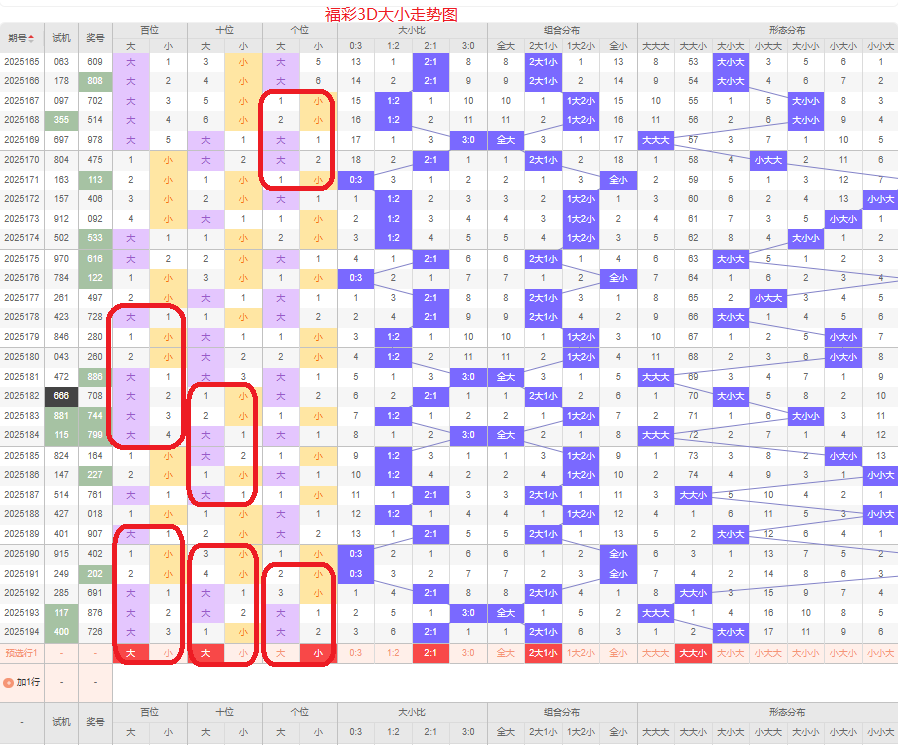 上期大小比为2:1,两大的号码组合方式,从近五期出现情况看,大号码出现7次,小号码出现8次,大小号码出现较平均,本期侧重两大的号码组合,本期百位侧重大号码,十位本期走大的概率很大,个位要侧重看小,侧重大大小或者小大小的号码组合,根据大小做五码定位56789/56789/01234或01234/56789/01234