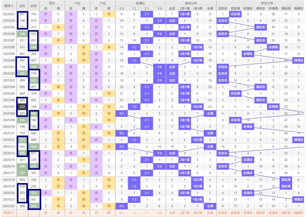 奇偶比例分析 - 奇偶比:322期号码为226偶偶偶形态,奇偶比例为0:3。结合历史数据与近期走势特征,本期可继续倾向于奇偶比为2:1的组合,即预测二位奇数搭配一位偶数。