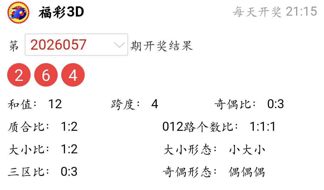 上期开出三偶2、6、4,和值:12,跨度:4,奇偶比:0:3,质合比:1:2,大小比:1:2, 012路个数比:1:1:1
