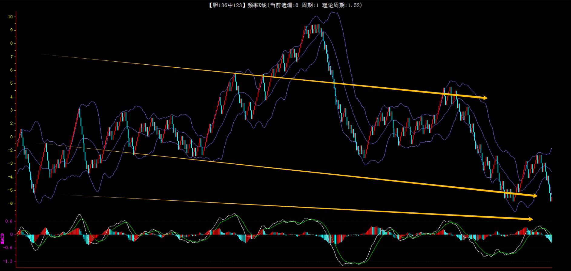 整体趋势下行,上边沿线趋势向下,下边沿趋势也是向下,节点震荡,当前开1期,本期防守。