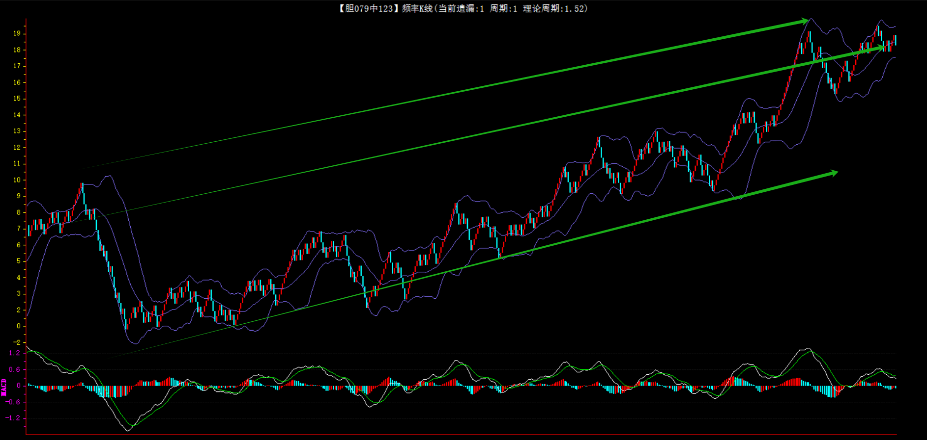 整体趋势上行,上边沿线趋势向上,下边沿趋势也是向上,节点震荡,当前遗漏1期,本期关注。