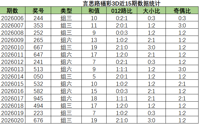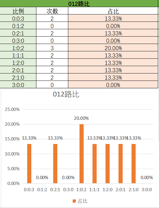 上期012路比是2:1:0,其中2:1:0占比变大,1:2:0占比变小。近15期内1:0:2是开出最多的,然后是2:0:1,0:2:1,0:0:3,1:2:0,1:1:1,2:1:0。总的看2路最热门,其次是1路,最后是0路,本期看好1:1:1和1:2:0。