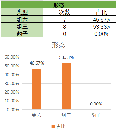 上期开的是组三,其中组六占比变小,组三占比变大。通过图示可以看到,组六在15期内开了7期,组三开了8期。本期关注组六,防组三。