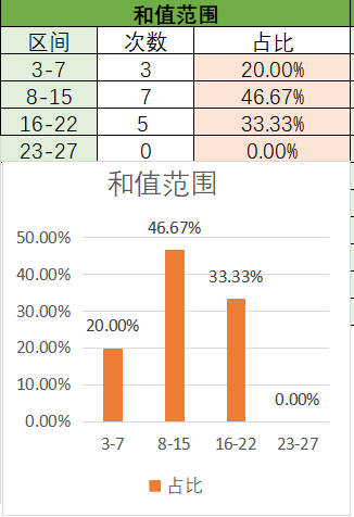 上期和值是19,处在16~22之间,各个类型占比没有变化。目前是8~15占比最优,其次是16~22,最后是3~7。本期看好和值在8~15之间,其次是16~22。