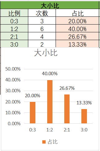 上期大小比为3:0,其中3:0占比变大,2:1占比变小。可以看到近15期内1:2优势最好的,其次是2:1,然后是0:3,最后是3:0。本期看好2:1开出,其次是1:2。