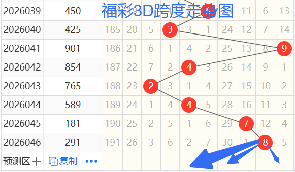 2)我们来看跨度;还是以042期——046期为例,如图依次是42478跨度,按照路数转换关系来看,那么跨度我们暂定369147跨 ,本期个人比较看好4 6 9跨。