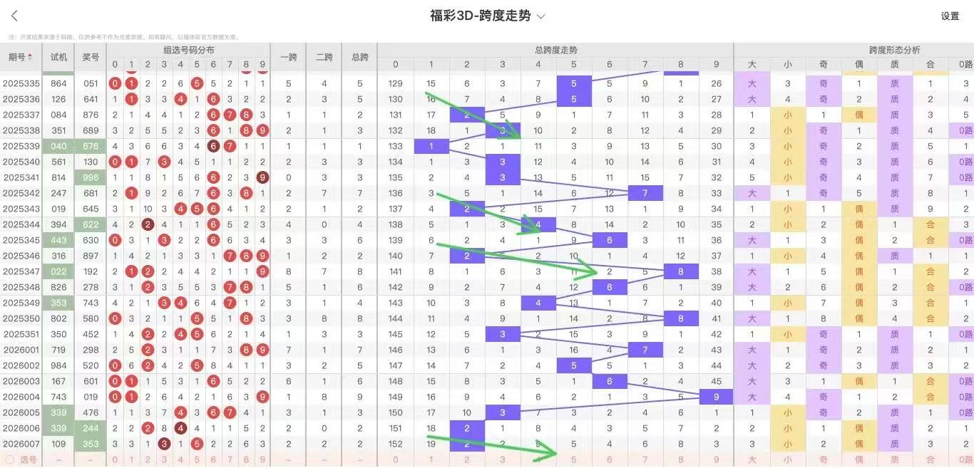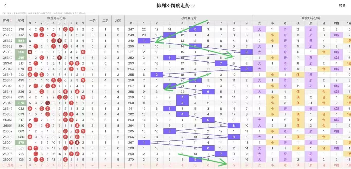 10期内跨度走势为:4-6-8-3-8-9-1-6-7-5,10期内大小跨比为7:3,奇偶跨比5:5,百期内跨度5共开出22次,下期数据:3 7 4 9 8 3 4 3 2 6 7 6 3 3 5 7 9 5 3 9 3 近期度较热,考虑跨度5开出后容易出大跨度,近期大小规律下小:偶:合,所以接下来继续小跨,偶跨度表现!