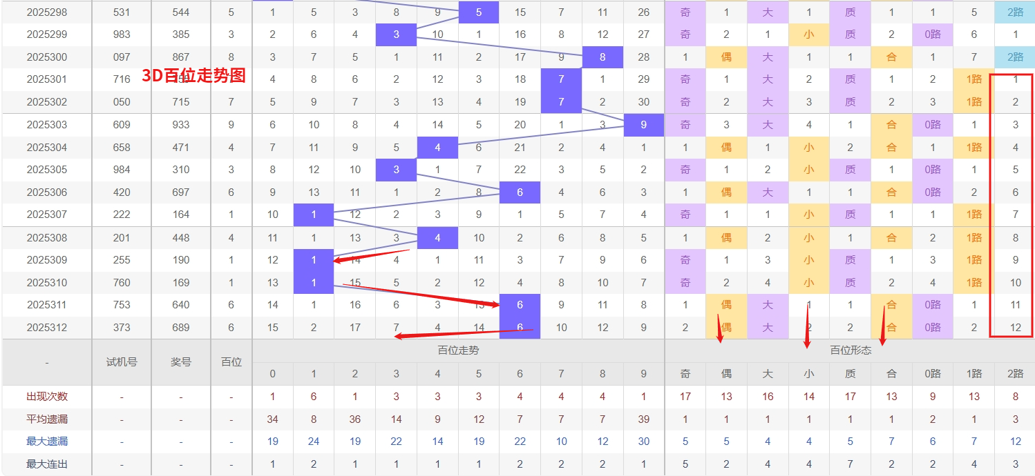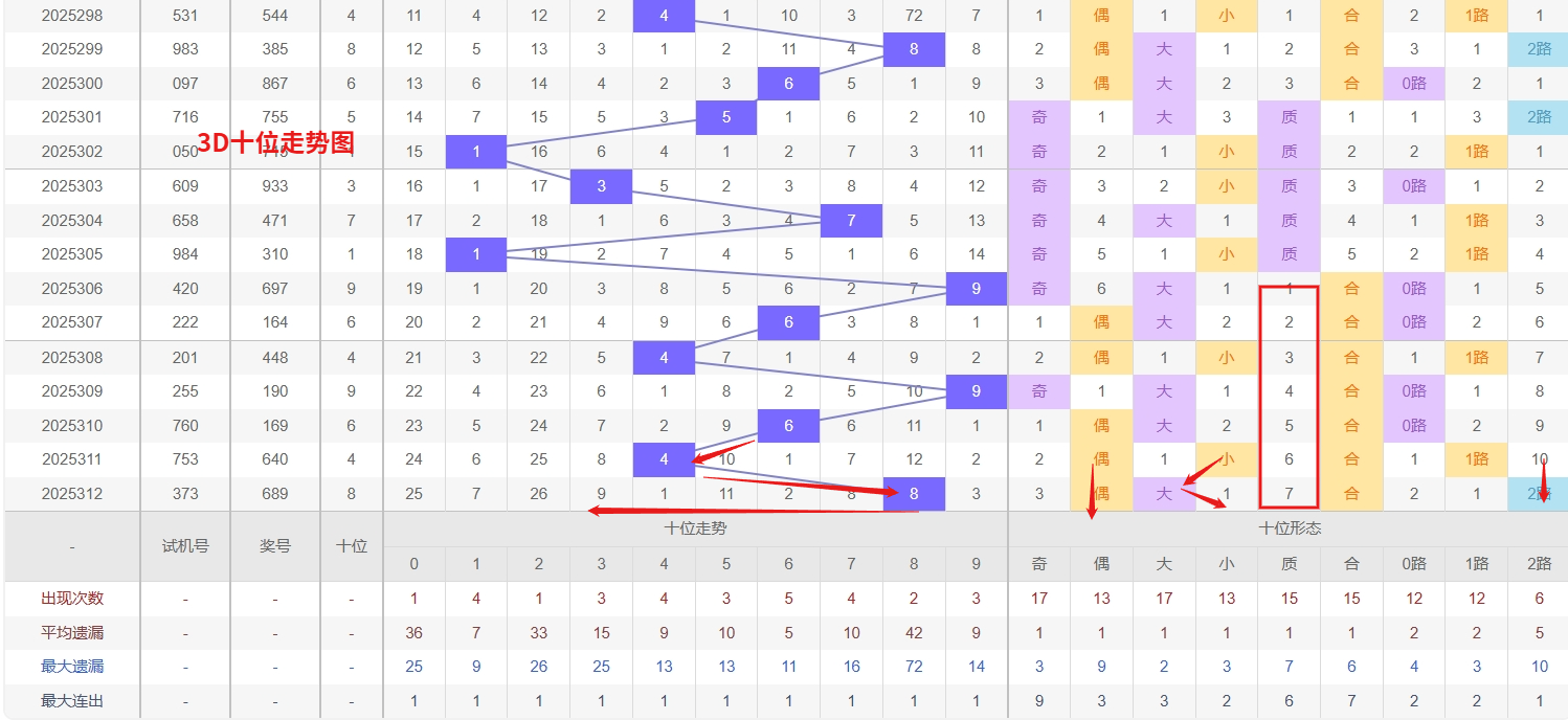 福彩3D十位分析:第2025312期十位开出号码8属大偶数号码后端。以历史100期数据为例十位奇偶比约为52比48,大小比约为55比45近期大小相差4点,根据求均衡的规律开出大数的概率比小数高一点。上期我们分析奇数经过连续回补后有走偶数的可能,开出奖号8大偶数符合我们的预期。近期3D十位走势分析,号码0和2已持续多期未见开出,明显处于冷态阶段,根据号码的平衡特性,冷号往往在经历较长遗漏后会出现回补机会,尤其0和2作为常用数字,其反弹动能值得重点关注,近期密切观察其回补信号。与此同时,号码6作为当前热号,近期表现相当活跃,频繁开出形成强势趋势,虽然热号难以持续保持高位状态,但通常不会立即转冷,短期内仍有再次开出的可能性,需要适当防守。综合来看,在十位选号时可采用冷热结合的策略,优先关注冷号0和2的回补机会,同时警惕热号6的持续表现,所以福彩3D第2025313期十位推荐02679。