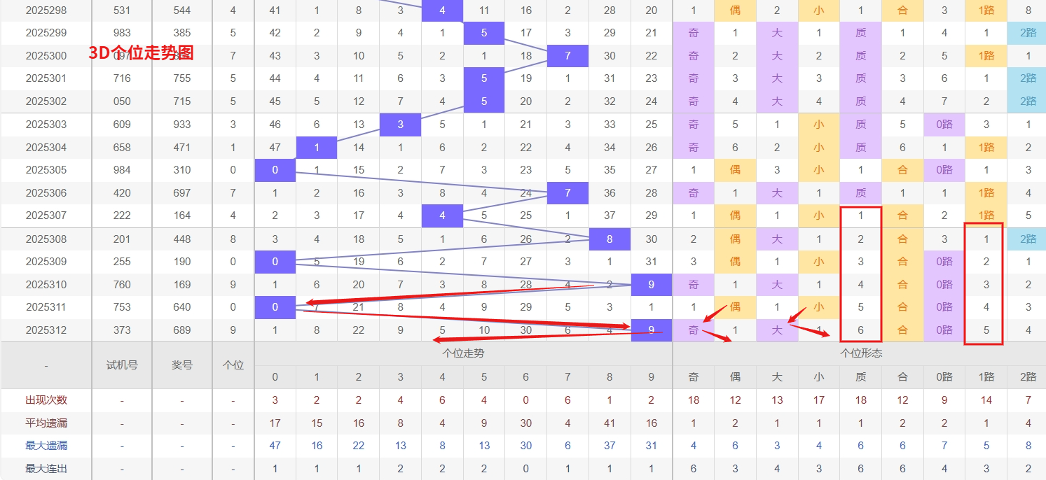 福彩3D个位分析:第2025312期个位开出号码9属于大奇数后端,从以上个位走势图中可以看出近100期的大小比约为48:52奇偶比约为51:49大小奇偶数据上有点差异有需求但不是太明显,不太好看这时就要借助连线走势和遗漏数据来帮助我们缩水号码。上期个位落号“9”大奇数0路号码球,号码开出了9振幅,连续多期的小振必被大振幅取代幅符合我们的预期,那么本期我们在个位考虑振幅走势走前依然要转变思路考虑大振幅,具体考虑(1-5)个振幅是我们主要的方向,那么在对个位落号情况进行系统的分析时我们可以明显的看到个位号码走势呈现大范围震荡,尤其是在号码的落位特点上表现的尤为突出,那么本期我们在个位分析时就要注意号码的风险,避免出现踏空。近期3D个位走势来看,号码4和5表现相当活跃,形成明显的热态趋势,热号往往具有持续开出的惯性,尤其当两个相邻号码同时走热时,更容易形成轮动连下的格局,因此接下来仍需重点关注4和5的强势延续。与此同时,号码6已连续遗漏30期未出,处于极冷状态,根据概率均衡原理,冷号在经历长期遗漏后,其回补动能会不断增强,此时对冷号6的出现需要格外防范,往往极冷号码的回补会出现在多数人放松警惕时。综合建议在个位选号时采取热号为主、冷号为辅的策略,既把握4和5的连下趋势,也要对冷号6的可能回补做好防守,因此福彩3D第2025313期个位看好12456。