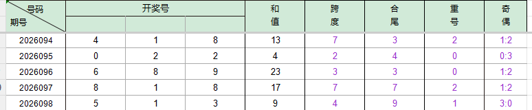 2026094期开奖号码418,我们可以看出近30期百位4出现4次,十位1出现7次,个位8出现5次。