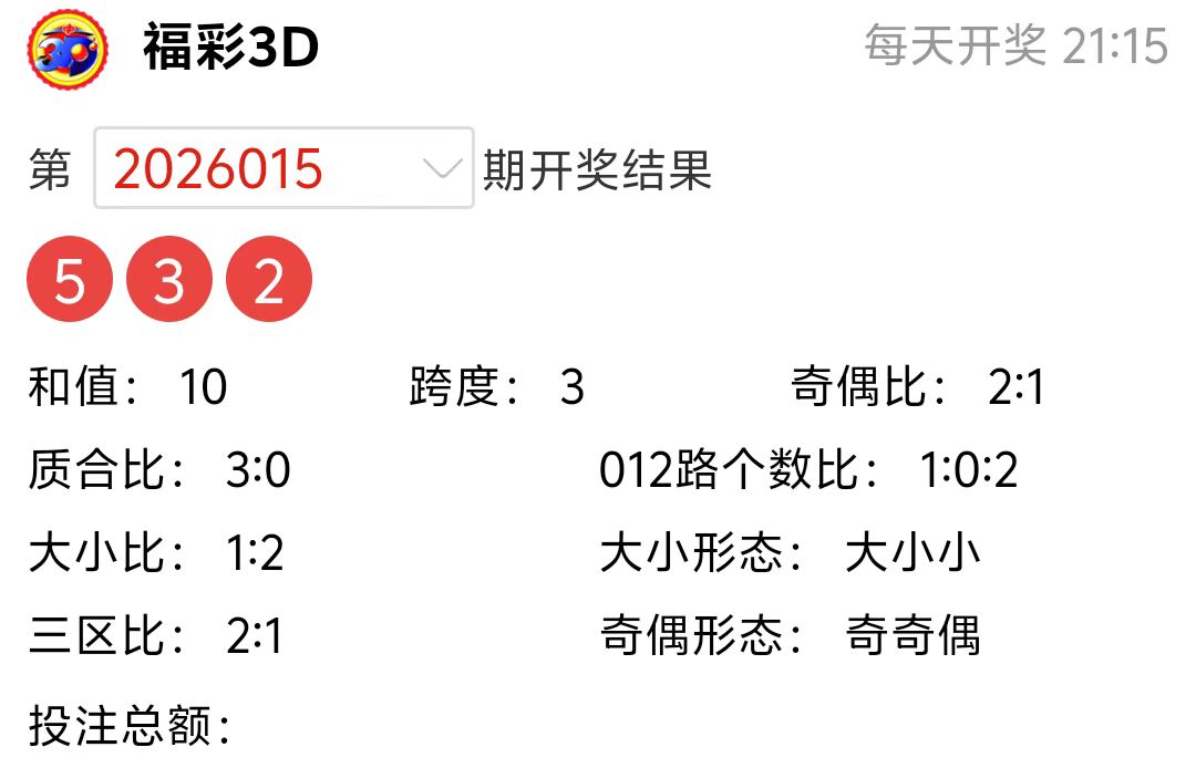 福彩3D上期(2026015期)开奖号码详情