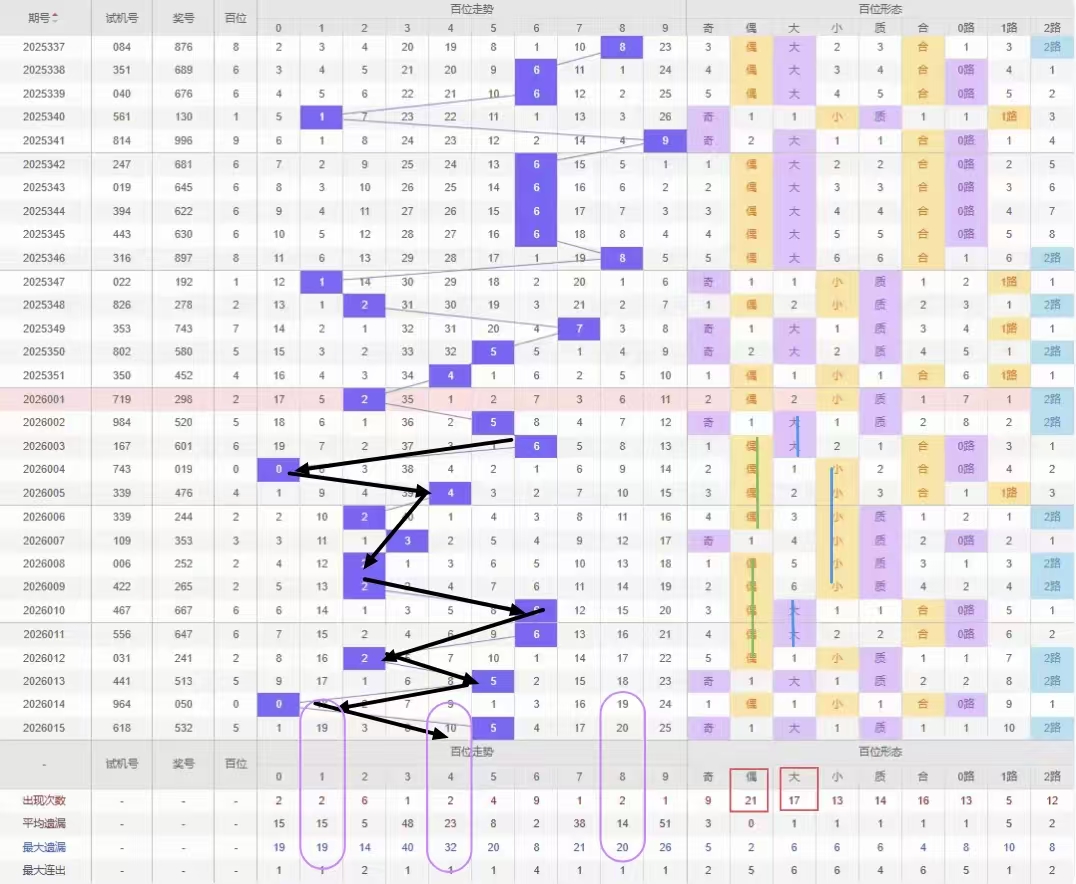 福彩3D第2026016期十位建议分析奇数偶数概率,如图所示近15期开出奇数号8期偶数号7期,开出偶数号的概率与开出奇数号的概率几乎相同,上三期开出奇数号那么本期继续开出奇数号的概率较大建议选择遗漏期数较大的奇数号。建议杀号定在所有偶数号,但偶数号0号、2号、8号都已经遗漏了10期以上建议开出防冷号开出。