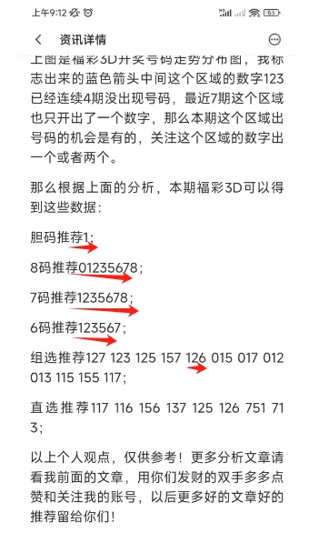 上图是福彩3D上期号码分析文章的截图,我最后推荐的胆码,8码,7码,6码全对,推荐的组选也猜对了126,这个你们去看上期的文章吧。