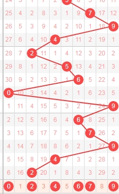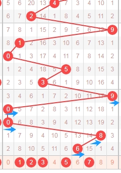 上图是福彩3D开奖号码走势分布图,我标注出来的蓝色横向箭头是跨度二组合,跨度二组合已经连续遗漏了6期,跨度二组合有02 13 24 35 46 57 68 79一共有8组,那么本期可以关注这些组合。