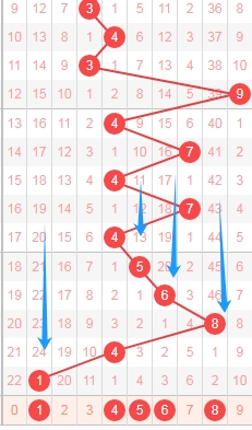 上图是福彩3D从左到右定位第三位数字走势图,我标志出来的数字都是遗漏周期小的数字,标注出来的蓝色大箭头表示遗漏周期,上期开出的数字1遗漏周期是24期,那么本期可以关注遗漏周期小的数字14568,个人最看好数字1568。