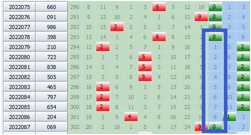 上图很清晰的描绘了一幅画面,比如2022078期开奖398当期为6跨的,为0路跨度,忽然0路跨度整8期消失未出现,从079期到086期开出的都是2路跨度和1路跨度,8期没有看到0路跨度了,这个时候一定要去关注0路跨度的中出,0跨是豹子号码,基本不考虑,因此就剩下了3、6、9跨度,所以087期应该重点关注3、6、9跨度,那么087期开奖069,刚好为9跨度,0路跨度中出。