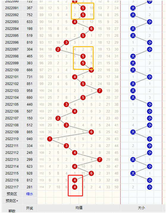 通过上图可以看到近期在福彩3D里和值的均值表现都比较平稳,在平均值上最多重复两次,比如091期和092期开奖号码是367、752它们的和值均值都是5,098期和099期开奖号是465、393,此时它们的均值也是5,最近两期是116期和117期开奖是812、281均值是开出了两期4,这也就说告诉我们如果在开奖号码里如果连续两期和值均值都是相等的,那么下期在开出同等的均值,是必须要排除情况,就单单这一点,就能排除多个和值,效果是非常不错的。