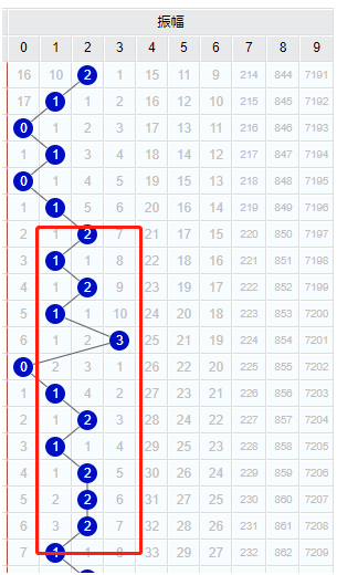 上图就是3D和值的均值振幅图表,通过图表可以看到和值均值图表里振幅都是开出小数字,基本无可能开出大数字,一般均值振幅为0、1、2、3之间,那么通过上期开出的均值就能准确的判断均值的开出范围,有了这个范围对于分析下期开奖号码的均值会起到决定性的作用。