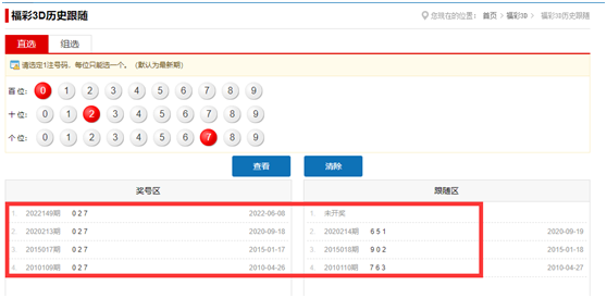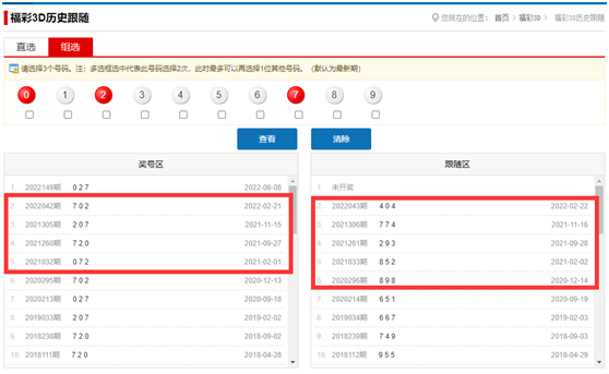 比如149期福彩3D开奖号码是027,那么首选就利用027的组选开奖号码开奖模式去搜索历史跟随。