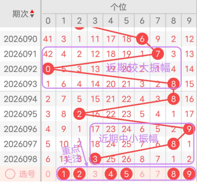 7期(092~098)开奖号个位号码球分别为0、8、8、2、9、8、3,开奖号与上一期走出的振幅分别为7、8、0、6、7、1、5。092期走出0号小数号码球,走出“7”的大幅度,093期走出8号大数号码球,走出“8”的大幅度,094期走出8号大数号码球,走出“0”的小幅度,095期走出2号小数号码球,走出“6”的中大幅度,096期走出9号大数号码球,走出“7”的大幅度,097期走出8号大数号码球,走出“1”的小幅度,098期走出3号中小数号码球,走出“5”的中大幅度;从近期振幅大小的走势及大小走势来看,中大振幅走在5~6之间较为适宜,中小振幅走在1~2之间较为适宜;结合走势图的整体及大小走势分析,本期个位应重点关注号码球为1、2、4、5、8、9