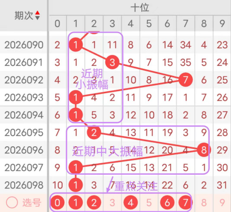 7期(092~098)开奖号十位号码球分别为7、1、1、2、8、1、1,开奖号与上一期走出的振幅分别为4、6、0、1、6、7、0。092期走出7号大数号码球,走出“4”的中小幅度,093期走出1号小数号码球,走出“6”的中大幅度,094期走出1号小数号码球,走出“0”的小幅度,095期走出2号小数号码球,走出“1”的小幅度,096期走出8号大数号码球,走出“6”的中大幅度,097期走出1号小数号码球,走出“7”的大幅度,098期走出1号小数号码球,走出“0”的小幅度;从振幅大小及走势图的整体对应来看,中大振幅走在5~6之间较为适宜,中小振幅走在0~3之间较为适宜;结合走势图的上下对应及振幅大小分析,本期十位应重点关注号码球为0、1、2、4、6、7