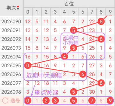 7期(092~098)开奖号百位号码球分别为8、5、4、0、6、8、5,开奖号与上一期走出的振幅分别为3、3、1、4、6、2、3。092期走出8号大数号码球,走出“3”的中小幅度,093期走出5号中大数号码球,走出“3”的中小幅度,094期走出4号中小数号码球,走出“1”的小幅度,095期走出0号小数号码球,走出“4”的中小幅度,096期走出6号中大数号码球,走出“6”的中大幅度,097期走出8号大数号码球,走出“2”的小幅度,098期走出5号中大数号码球,走出“3”的中小幅度;从振幅大小及走势图的整体形势,中大幅度走在4~5之间较为适宜,中小幅度走在0~3之间较为适宜;结合走势图的整体及大小走势分析,本期百位需重点关注号码球为0、2、3、5、7、9