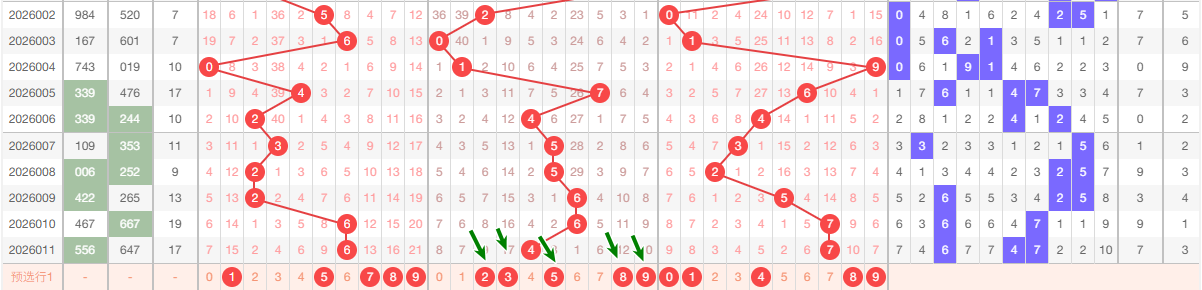(二)、十位号码走势分析     上期十位开出4,本区与上期的跨度为2,本期我们重点关注 358,本期十位推荐关注:23589